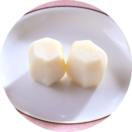 慈姑(くわい)には、翌春に伸びる芽がついているので、「芽が出る」にかけて、縁起ものの野菜としておせちや祝い事の料理に用いられます。そのような「目出度い(めでたい)」くわいを松ぼっくりに見立て松笠造りとしました。煮あげる時に、クチナシの実と共に煮ましたので、鮮やかな黄色に仕上がっております。